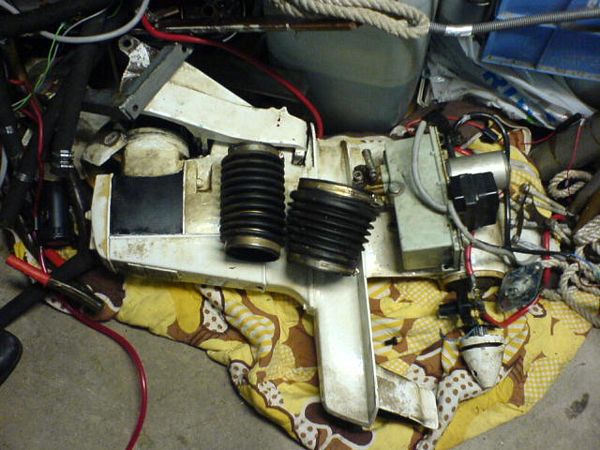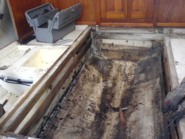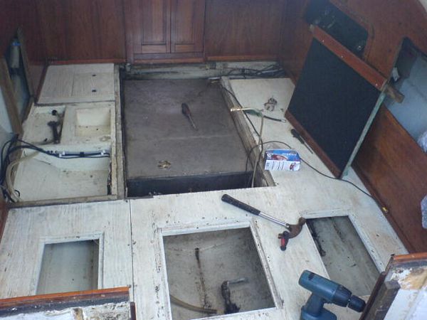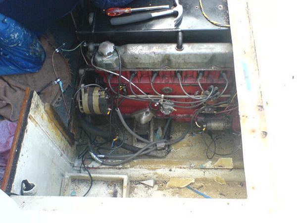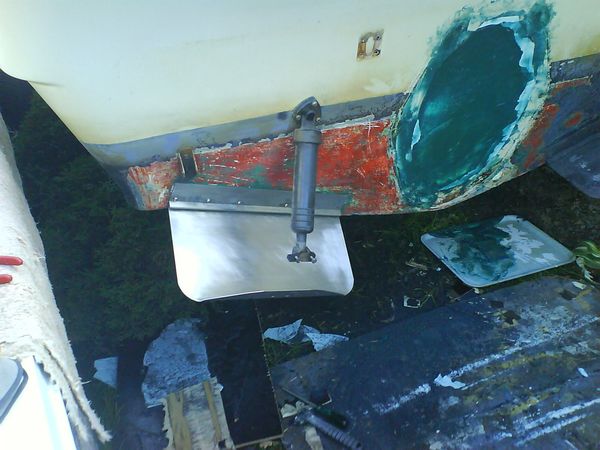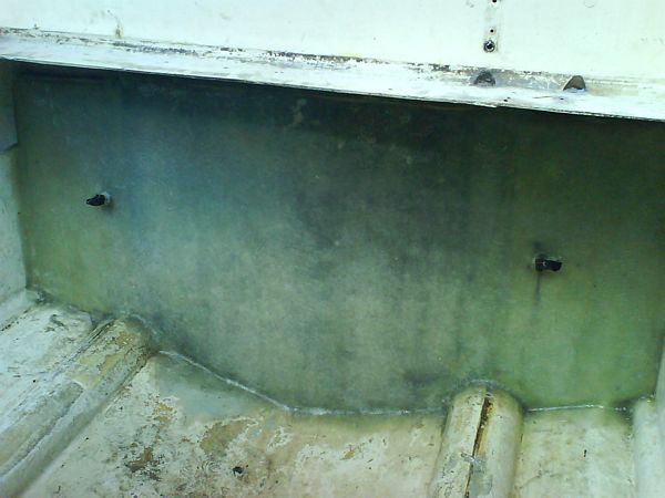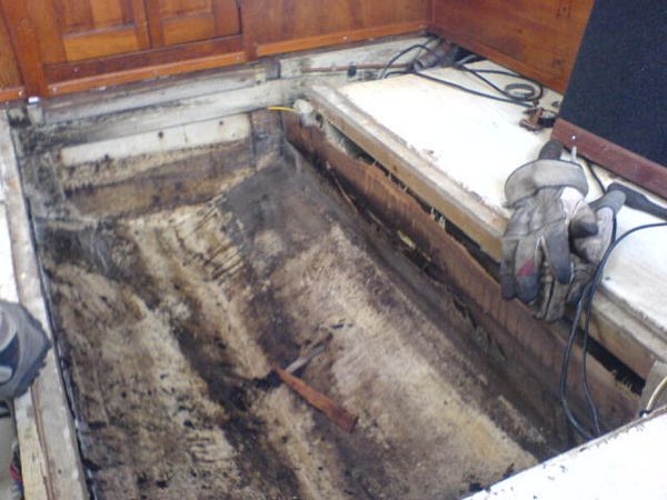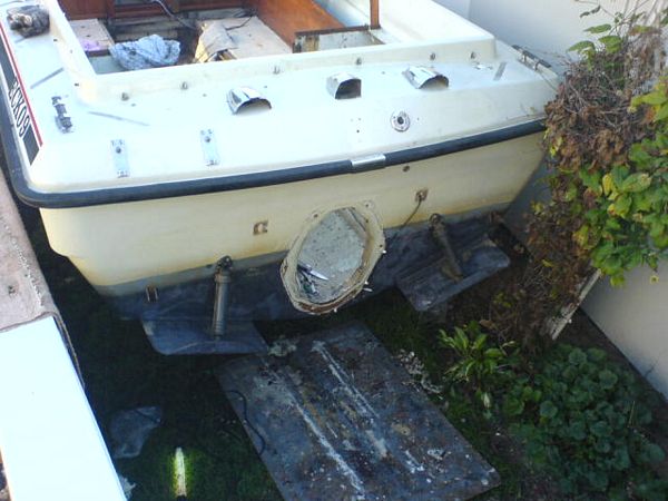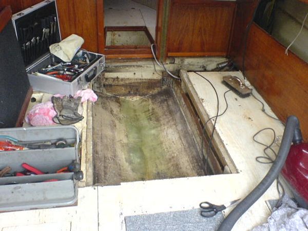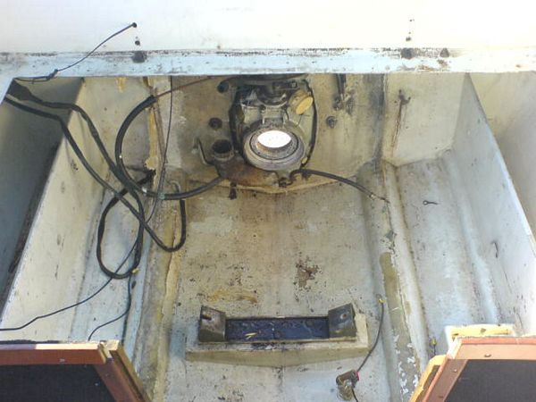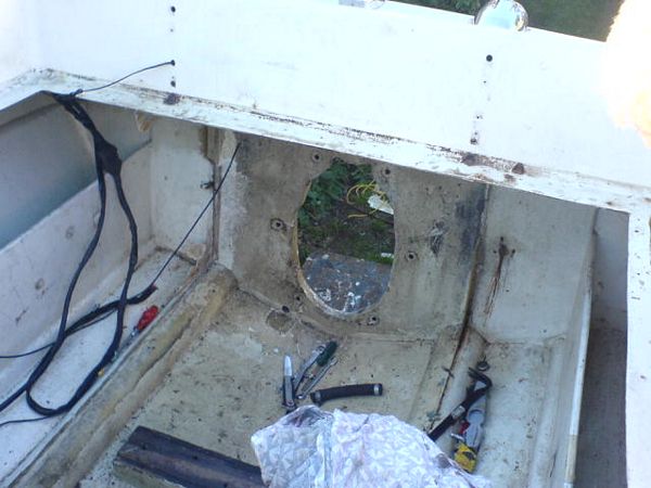 060923 - Tomt som i kyrkan, här skall göras rent, plastas och målas innan nya maskinen skall i, sköld hålet alldeless för stort, vilket gör att vi måste bygga upp en ny akterspegel i björkplyfa!